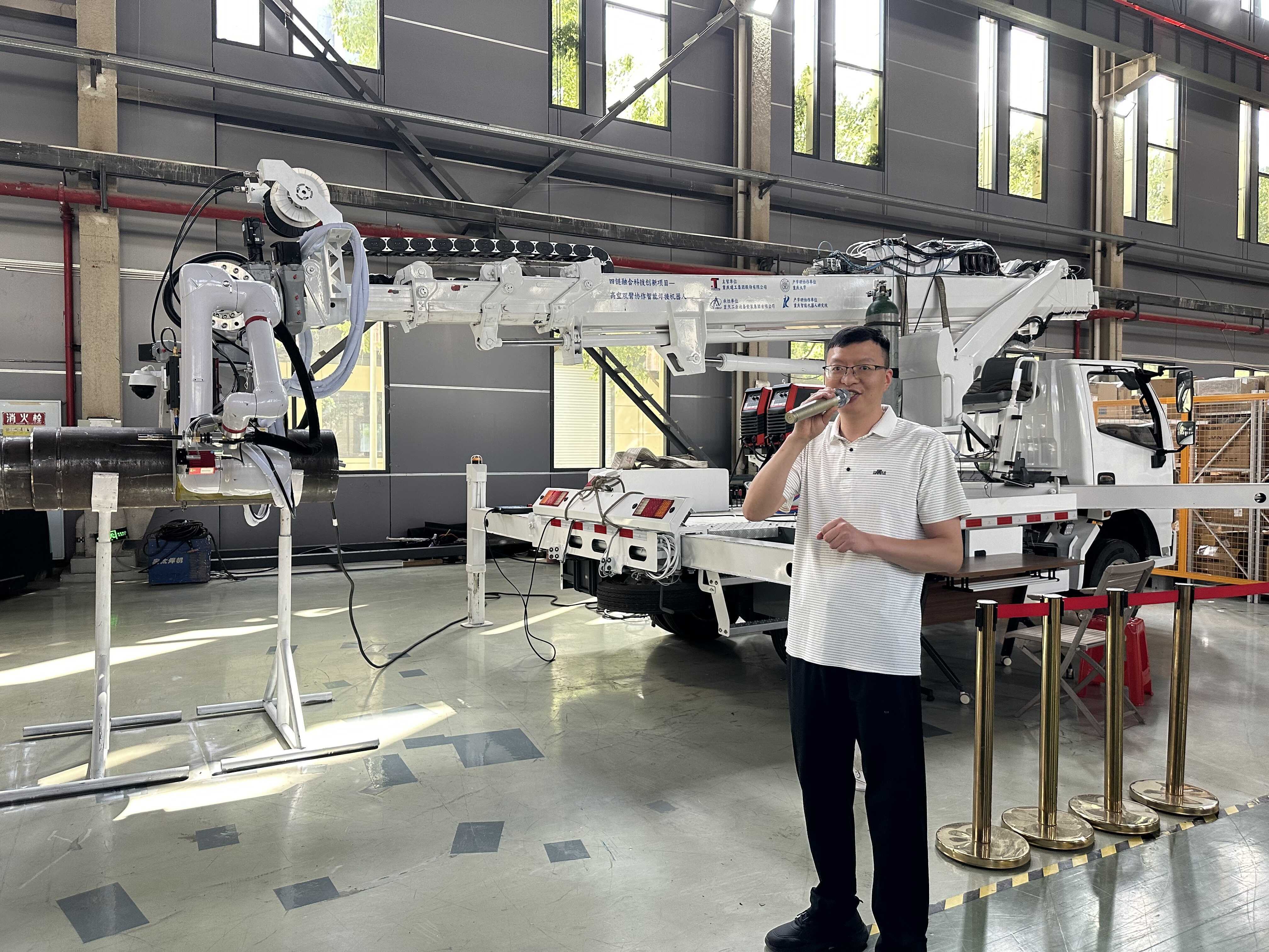重庆华数机器人有限公司科技创新办公室主任郑登华介绍企业情况。中国经济网记者 杨淼摄